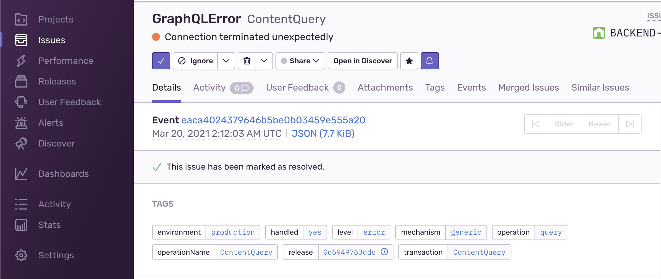 startTransaction(default:true) - Starts a new transaction for every GraphQL Operation. When disabled, an already existing Transaction will be used.renameTransaction(default:false) - Renames Transaction.includeRawResult(default:false) - Adds result of each resolver and operation to Span's data (available under "result")includeExecuteVariables(default:false) - Adds operation's variables to a Scope (only in case of errors)appendTags- See example above. Allow you to manipulate the tags reports on the Sentry transaction.configureScope- See example above. Allow you to manipulate the tags reports on the Sentry transaction.transactionName(default: operation name) - Produces a name of Transaction (only when "renameTransaction" or "startTransaction" are enabled) and description of created Span.traceparentData(default:{}) - Adds tracing data to be sent to Sentry - this includes traceId, parentId and more.operationName- Produces a "op" (operation) of created Span.skip(default: none) - Produces a "op" (operation) of created Span.skipError(default: ignoredGraphQLError) - Indicates whether or not to skip Sentry exception reporting for a given error. By default, this plugin skips allGraphQLErrorerrors and does not report it to Sentry.eventIdKey(default:'sentryEventId') - The key in the error's extensions field used to expose the generated Sentry event id. Set tonullto disable.
